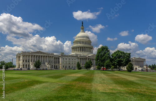 Washington DC Capitol building. Congress on Capitol Hill in Washington DC. American flag over Capitol. Washington DC landmark. Senate and House in Washington D.C..