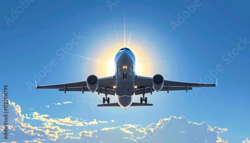 Low-angle, full shot of a passenger plane against a light blue sky, clouds, and sun. The plane is centered and flying towards the viewer