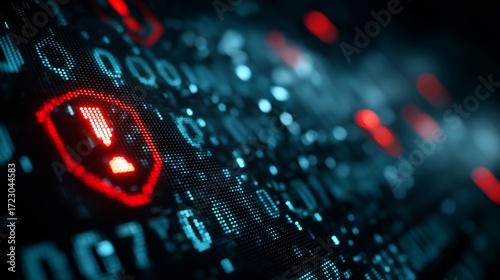 Binary Code with Red Shield Warning Symbols Indicating Cybersecurity Breach, Digital Vulnerability and Data Risk, Futuristic Representation of Hacking, Protection and Information Threat