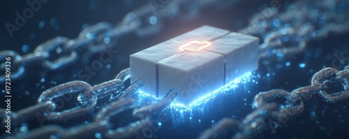 A futuristic block connected by glowing chains, symbolizing innovation and digital networks in a sleek digital environment.