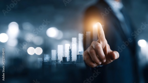 A businessman s finger touches a glowing point above an industrial growth chart symbolizing investment and progress