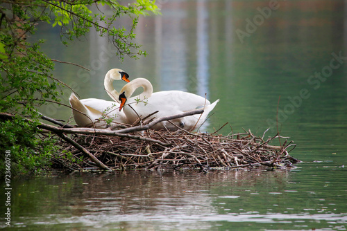Höckerschwan (Cygnus olor) Vogelpaar auf Nest im Wasser