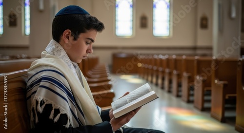 Young Jewish prayer and tradition/ Jewish faith and spirituality in synagogue atmosphere