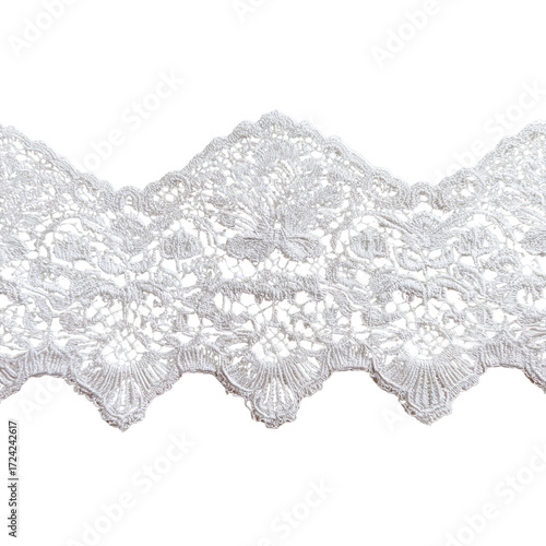 White lace trim with intricate floral patterns, perfect for sewing and crafting projects. background removed