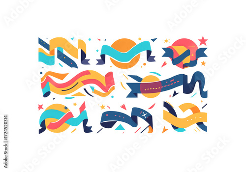 set of flat vector ribbons, minimal geometric shapes, bright sol