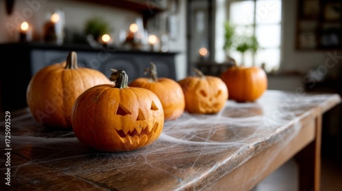 Carved pumpkins glow eerily on a cobweb-draped table, inviting whispers of Samhain and folkloric phantasmagoria