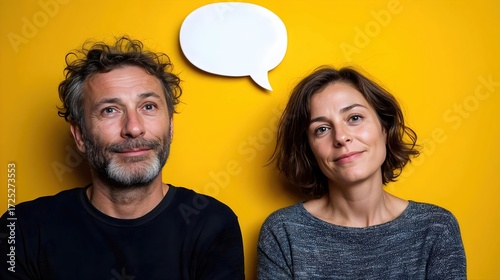 Deux personnes souriantes devant un mur jaune avec bulle de dialogue