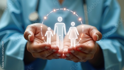 Manos sosteniendo iconos familiares holográficos flotantes, concepto de atención médica, rehabilitación de discapacitados, cobertura de seguro, compasión voluntaria