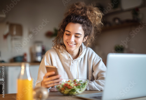 Bienestar digital y conexión personal en la rutina diaria. Mujer sonriente disfrutando del desayuno y el teléfono con el portátil cerca.