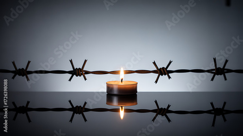 A lit candle placed behind barbed wire with a reflective surface below, symbolizing hope or remembrance in confinement.