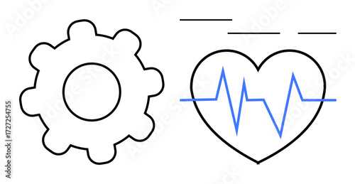 Gear alongside a heart with a blue heartbeat line symbolizes health monitoring, innovation, and tech synergy. Ideal for health tech, medical devices, diagnostics, data analysis, workflow