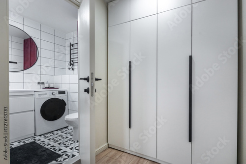 Stylish modern bathroom entrance with elegant design and rational layout, as well as laundry facilities.