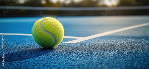 Close-up of a yellow tennis ball resting on the textured blue tennis court near the white boundary line under warm sunlight