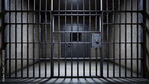 Dimly lit empty prison cell featuring heavy iron bars and the locked steel door within the background, viewed from the front perspective, creating a stark and confined atmosphere
