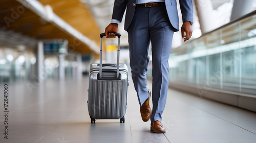 Close-up of a manâs legs and suitcase while walking in airport corridor, business and tourism concept, travel lifestyle photography, global transportation theme. traveler legs, sui