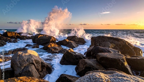 Dramatic sunset over crashing waves on rocky shore