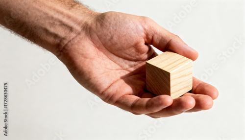 Male hand holding a single small wooden cube. Concept for a basic building block, foundation, creativity, simplicity, and strategy. Isolated on a plain white background.