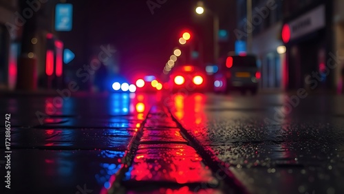 Glowing red and blue emergency lights reflecting on wet pavement in dramatic night scene.