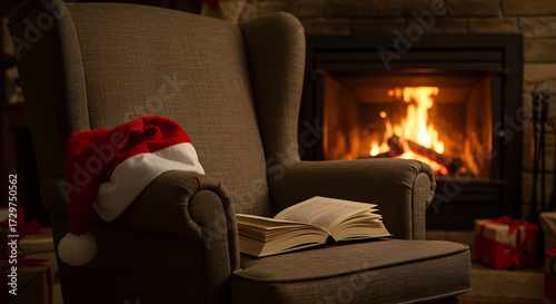 Open book on a cozy chair near the fireplace, with Santa hat resting on the side, warm atmosphere