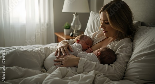 Mother breastfeeding twins in a cozy bedroom under soft light