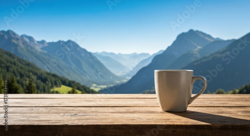 Mountain vista with a coffee cup on a wooden table