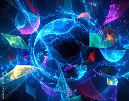 A vibrant abstract composition of a glowing blue energy orb surrounded by colorful translucent geometric shapes.