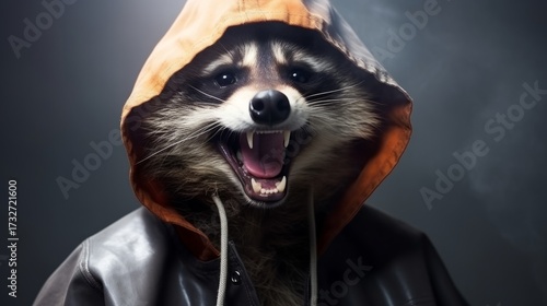 Raccoon wearing an orange hooded jacket, showing sharp teeth and a fierce expression, stands confidently against a dark background, embodying a playful yet edgy character