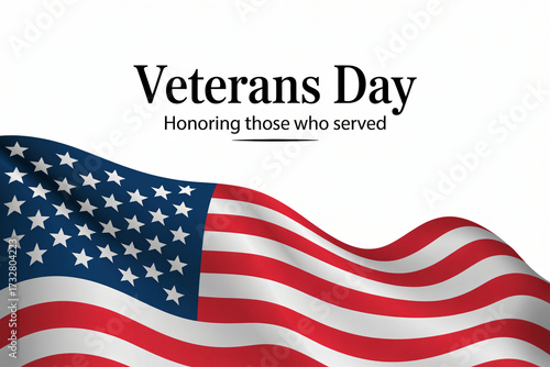 Veterans Day text with simple American flag curve. Minimalist tribute banner honoring all military veterans.