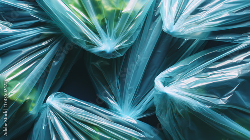 Sustainable packaging concept showing tied translucent plastic bags containing produce creating reflective texture and subtle green tones