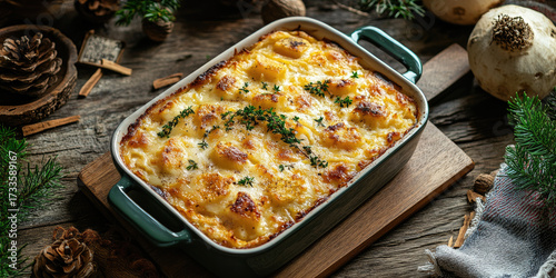 Warm rutabaga bake encased in a crispy golden layer, situated amidst cheery holiday embellishments such as pine garlands, baubles, and cinnamon sticks, placed on a vintage wooden table