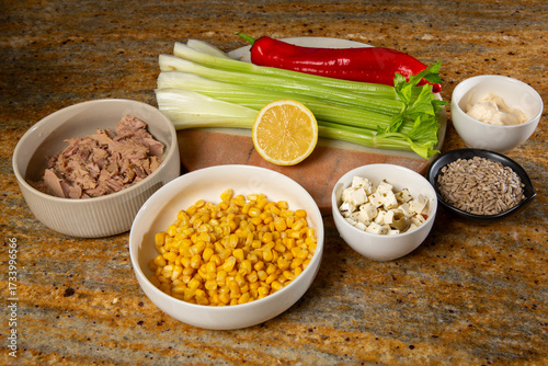 Produkty do pysznej sałatki z tuńczykiem i selerem naciowym