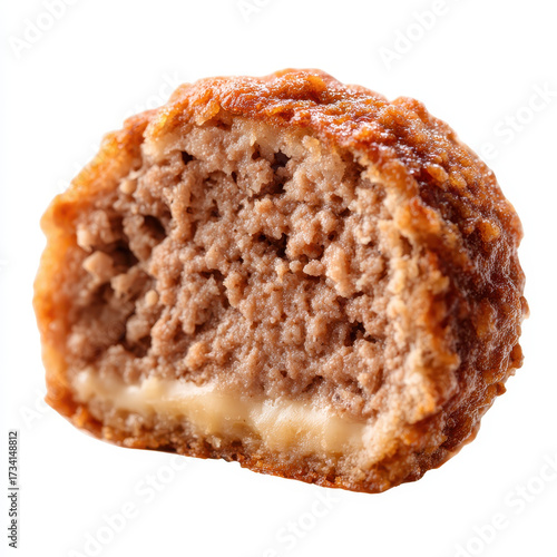Meatball cross section showing juicy ground beef texture and melted cheese center, isolated on white background, savory and appetizing comfort food closeup