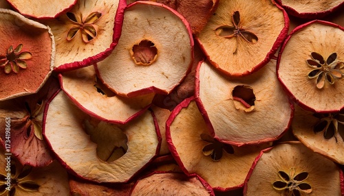 artistic close up of dried apple slices arranged as a textured background from a top view with rustic and organic details