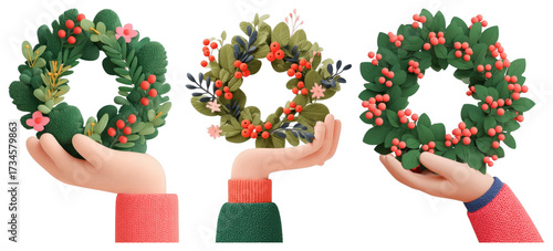 PNG Colorful festive wreaths in hands, element set on transparent background