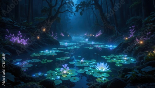 Underwater flora radiates an ethereal glow, illuminating the dark waters of a mystical forest pond at night.