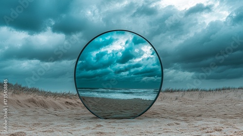 Reflective mirror on sandy beach captures moody clouds and ocean waves during a stormy day