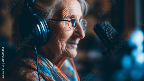 Elderly woman with glasses and headphones speaking into a microphone in a recording studio setting