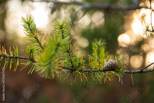 Gałąź sosny lśni ciepłym, złotym światłem zachodzącego słońca w spokojnym lesie.