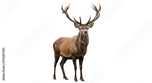 Isolated red deer stag standing proud, looking directly at camera, majestic antlers