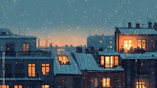 Falling snowflakes gently drift over city rooftops at dusk, illuminating warm, inviting lights from apartment windows, creating a cozy, peaceful atmosphere in a wintry urban scene, evoking feelings...