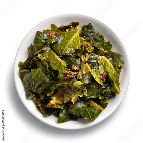 Plate of collard greens cooked southern style, isolated on white background.