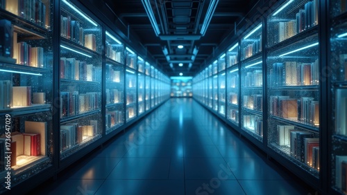 A visually immersive archive extending infinitely into the distance, filled with transparent glowing book-like structures. Data streams cascade between them, sense of endless knowledge preservation.