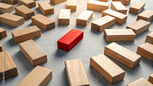 Red Block Standing Out Symbolic Representation of Being Different and Unique in a Crowd The Leader in the Center One Red Wooden Rectangle Surrounded by Identical Natural Blocks