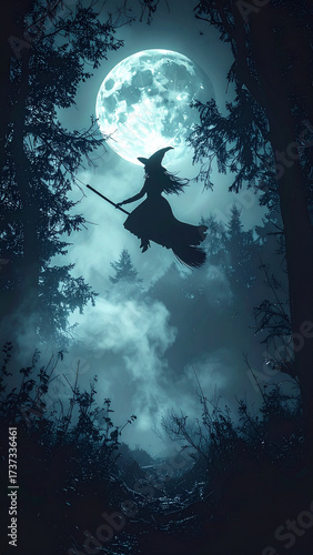 Halloween Vertical Background with Flying Witch and Full Moon for Spooky Social Media Stories