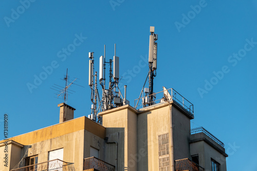 Antenas de transmissão 4G e 5G e repetidores de sinal montados no topo de um edifício, em contraste com um céu azul