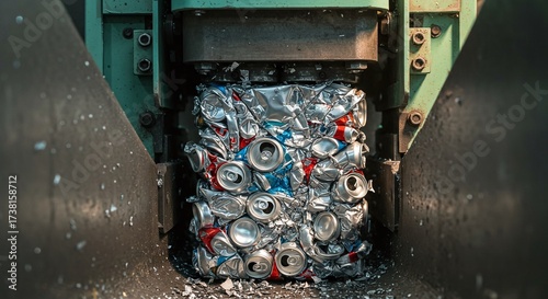An industrial baler machine compresses used aluminum cans into a dense cube for recycling.Concept of scrap metal compaction for recycling.