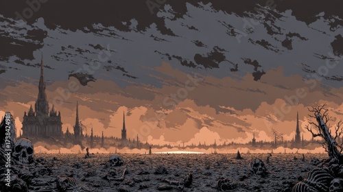 Dark Gothic Cityscape with Skulls and Bones on Barren Ground Under Ominous Cloudy Sky at Twilight