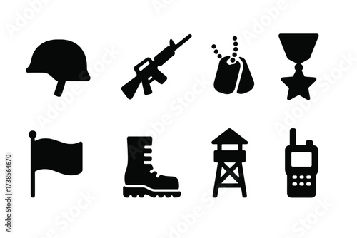 Military Icon Set. Solid, filled icon set of military duty: soldier helmet, rifle, dog tags, medal, flag, boots, watchtower, radio. Solid, filled icons in only