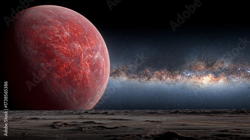 A breathtaking image of deep space featuring a vibrant galaxy stretching across the background and a large red planet situated prominently in the foreground.