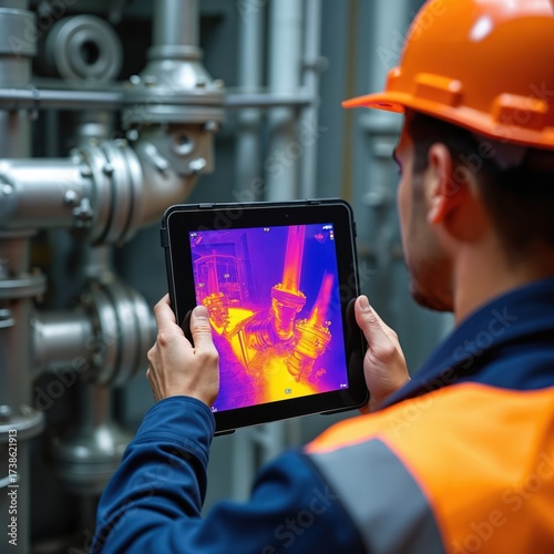 Industrial worker uses tablet with thermal imaging camera. Monitors plant equipment, checks heat on pipes. Man inspects machinery for safety, maintenance, fault detection. Engineer works with modern